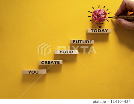 You create your future today symbol. Concept words 'You create your future today' on wooden blocks on a beautiful yellow background. Businessman hand. Business, motivational and create future concept.