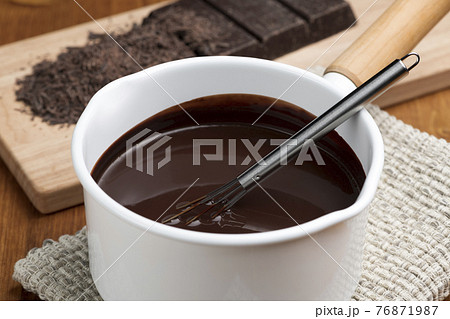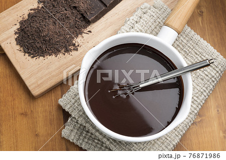 刻んだチョコレートを鍋で溶かす チョコレートフォンデュ