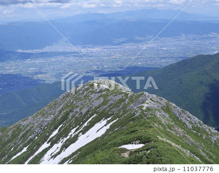 常念岳から見る前常念岳への稜線と安曇野の町並み