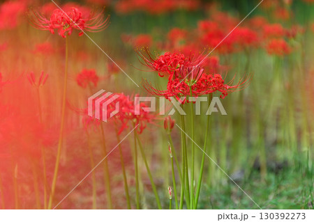 前後ボケに挟まれた群生する彼岸花