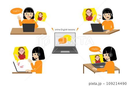 ヘッドホンを着用してオンライン英会話をしている黒髪の日本人女性の4つのアングルのイラストセット