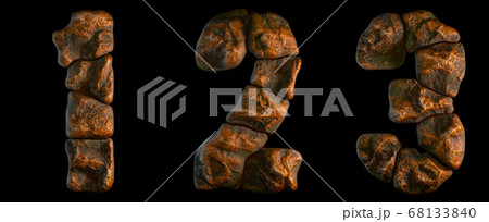 Set of rocky numbers 1, 2, 3. Font of stone on black background. 3d