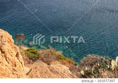 The rocky coast of the Mediterranean Sea on the Akamas Peninsula in the northwest of the island of Cyprus.