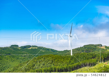 山の頂上付近に設置された風力発電用大型風車と送電線