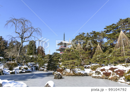 仙台 北山 輪王寺の日本庭園 三重塔と雪吊り