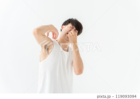 若いアジア人男性の脱毛エステの全身の箇所指示白バックのイメージイラスト図