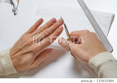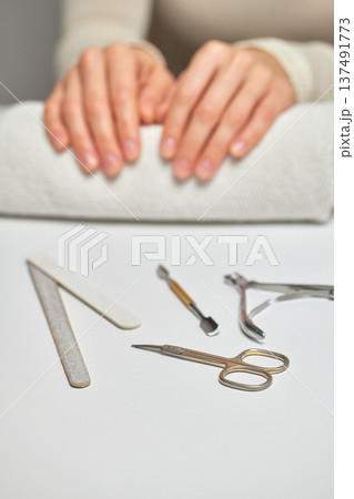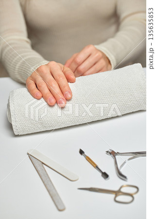 Woman's hands resting on a towel with various manicure tools on a white surface