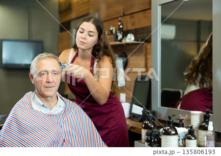 Senior client getting haircut with clipper from skilled female barber in barbershop