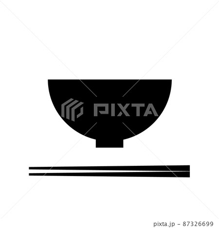 お茶碗と箸の白黒アイコン。食事のイメージイラスト。