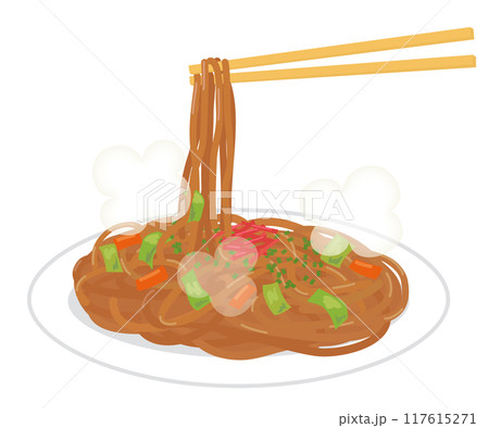 皿に盛られた湯気の立つ焼きそばに割り箸