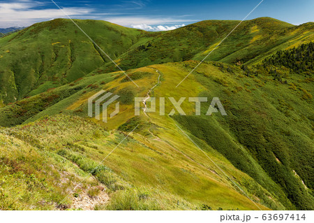巻機山・牛ヶ岳稜線から見る割引岳への登山道を行くハイカー