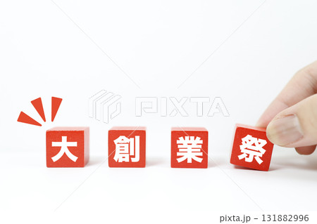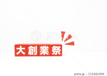 大創業祭を表す4つの赤いブロック。白背景とコピースペースの広告素材。