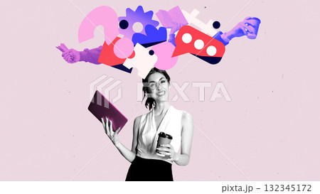 Creative digital artwork. Smiling woman with laptop and coffee symbolizing mental balance in digital work life