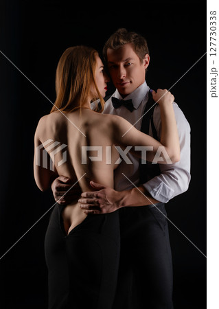 Couple sharing an intimate moment in a dimly lit studio setting