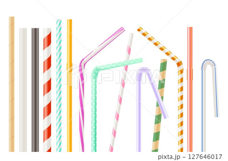 Realistic drinking straw. Plastic straws for cocktail drink glass, 3d bendy tube red stripe reusable paper bamboo pipes drinking juice alcohol beverages, exact vector illustration