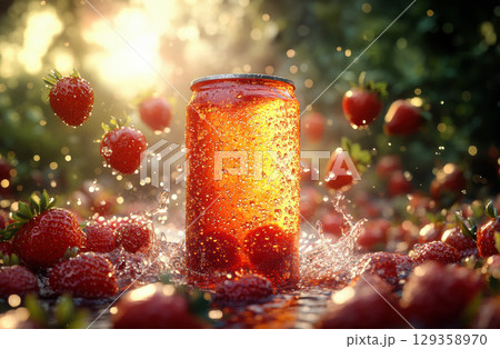 Transparent jar soda can splashing into water with fresh strawberries flying around in dramatic motion and water droplets