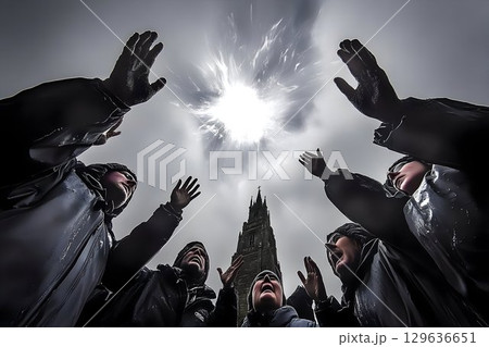 Community gathering hands raised towards light hope spirituality