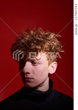 Thoughtful young man with curly hair against bright red background, casting shadow. Man turned slightly away from camera, creating a dramatic and introspective mood