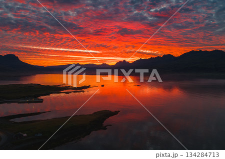 A vivid sunset reflects on a serene body of water in Iceland, with red and orange hues. Silhouetted peaks and a small peninsula add depth to the scene.
