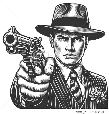 Gangster Aiming Gun engraving vector illustration