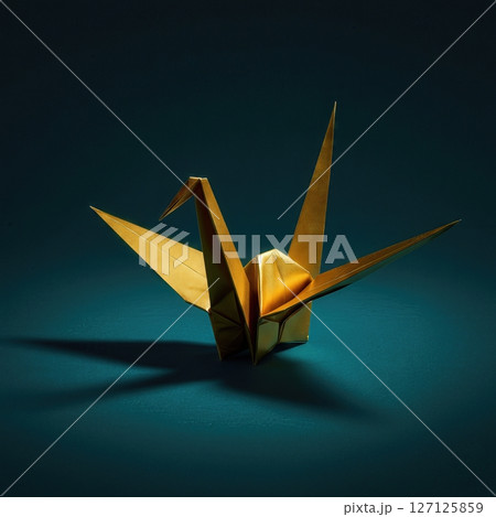Elegant origami paper crane with dramatic lighting on dark teal background showcasing traditional Japanese folding art and minimalist aesthetic design