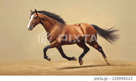 山岳地帯の斜面を、白馬が勢いよく駆け抜ける瞬間を捉えた写真。風を切ってたてがみが舞い上がり、筋肉の動