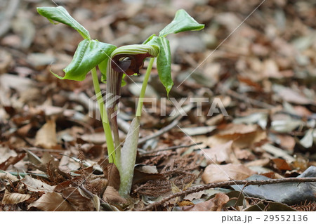 自然 植物 ムサシアブミ、開花と葉の展開は同時でこの後葉はどんどん成長します