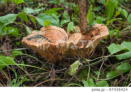 Forest mushrooms Saffron Milk Cap growing in a green moss.