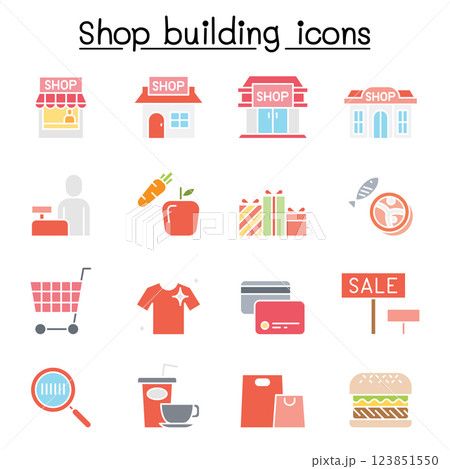 Shop building, Shopping mall, supermarket icon set in flat color style