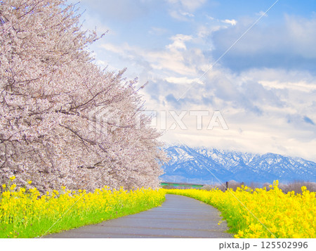 新潟県新発田市 加治川河川敷の菜の花と桜