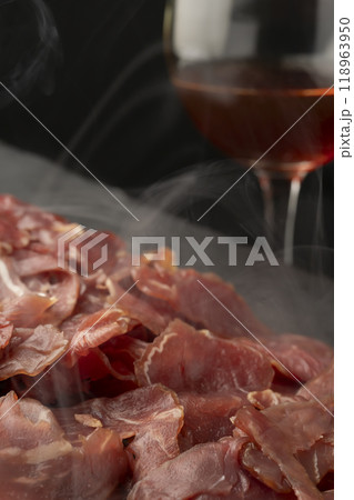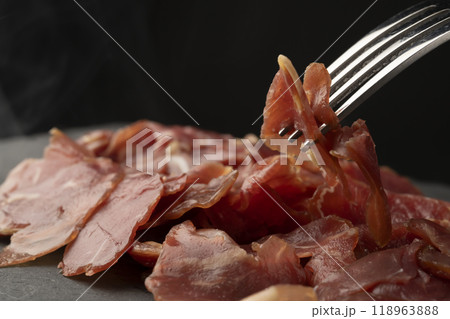 生ハム 牛生ハム スモーク 煙 フォークで生ハムを持ち上げる