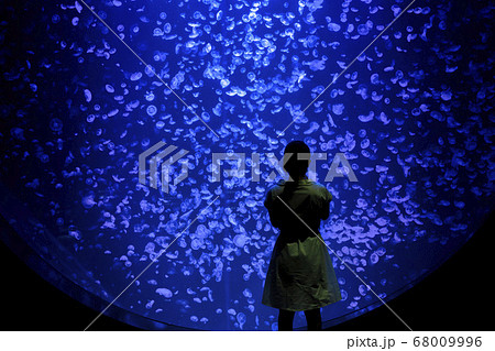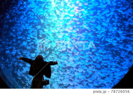 クラゲ水族館 円水槽 加茂水族館 水槽のクラゲを見る人 イメージ素材 山形観光スポット