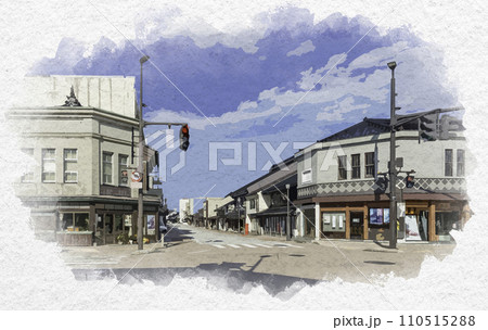 水彩画風 高岡 山町筋の町並み 木舟町交差点 富山県高岡市