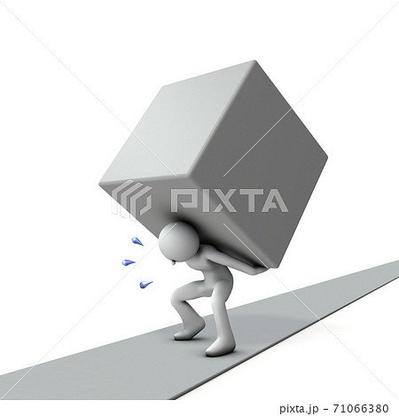 大きな荷物を背負って進む人物。困難なプロジェクトの進捗を表すコンセプト。過重とストレス。