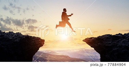 谷を飛び越えるビジネスマン ビジネスと挑戦