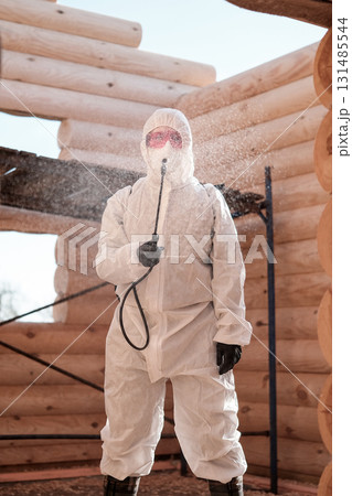 Faceless pest control worker in a protective suit sprays insect poison in a living room