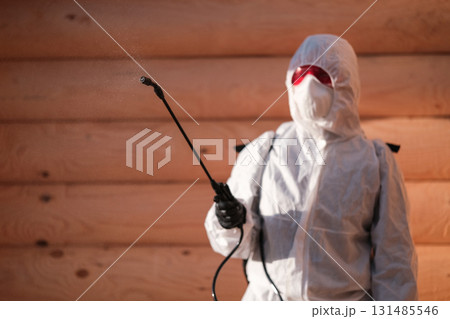 Faceless pest control worker in a protective suit sprays insect poison in bedroom