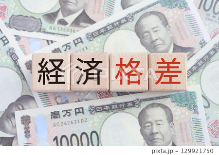 経済格差を象徴する1万円札と赤文字の日本語ブロック