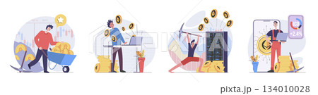 Cryptocurrency mining concept with people scenes set in flat web design. Collection of character situation with crypto miners getting coins, working with data at bitcoin farm. Vector illustrations.