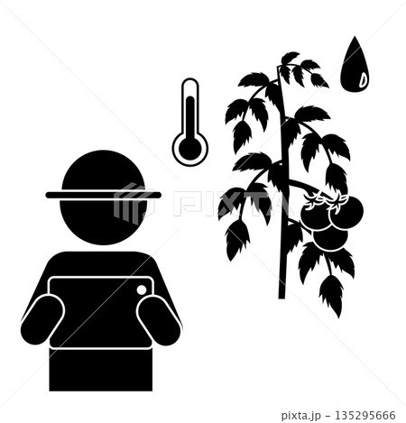 タブレットで温度と水分を管理するトマト農家のスマート農業ピクトグラム