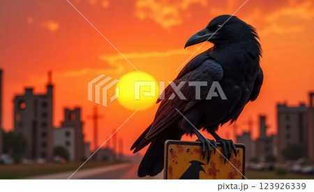 Raven perched on warning sign at sunset with urban decay in the background showcasing a somber and evocative atmosphere