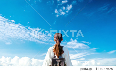 青空に向かって立つリュックを背負った女性の後姿,generative ai_ワイド