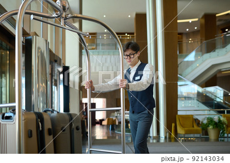 Young man in uniform of bellboy pushing cart with luggage along lounge