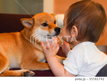 柴犬が頬をペロリ日本の子どもの笑顔が弾ける瞬間
