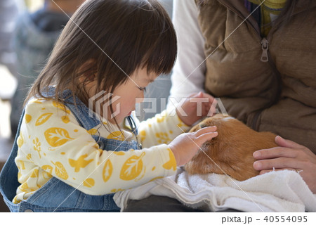 モルモットをさわる2歳の幼児
