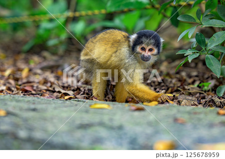 葉を見つめる可愛いリスザル 好奇心旺盛