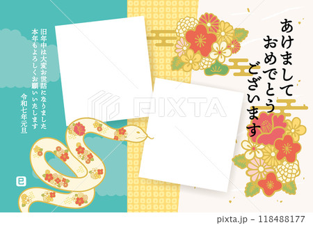2025年年賀状 和柄の巳とフォトフレームデザイン