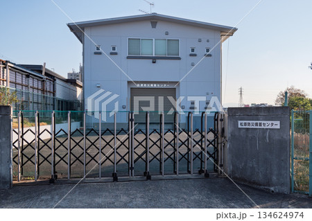 大阪府松原市の防災備蓄センター全景:水害や地震に備える1980年代建築の倉庫と青いネット対策の門
