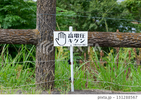 電気牧柵があるため危険の警告看板の風景