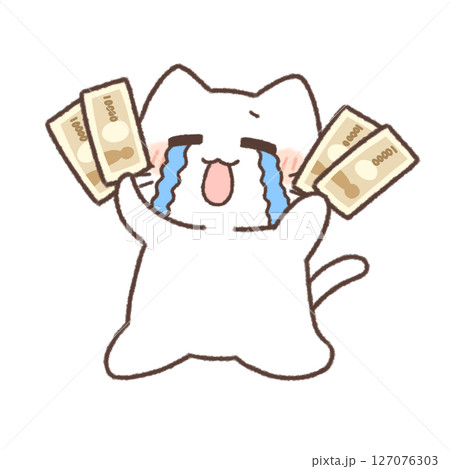 嬉し泣きしながら、両手にお金を持ってスキップしている白い猫のイラスト